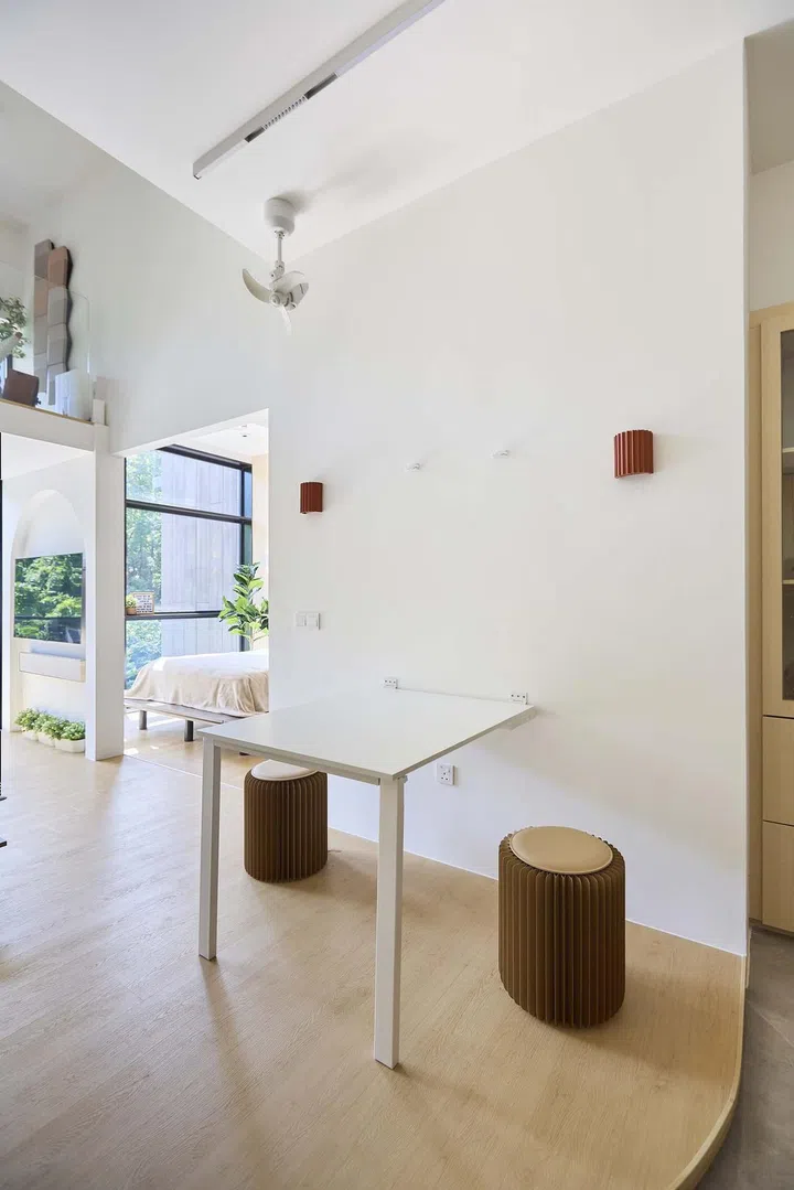 Moving beyond the kitchen, the dining and living areas are elevated on a low platform to create layering and a sense of entering a different realm within the home. What appears to be an artwork on the wall to the right flips down to become a dining table with one end hinged against the wall. This two-in-one feature allows the dining table to fold away when not in use to free up space within the compact apartment. The living room is a minimalist and clean space with a re-upholstered sofa from the couple’s previous home, a small coffee table and a rug below.