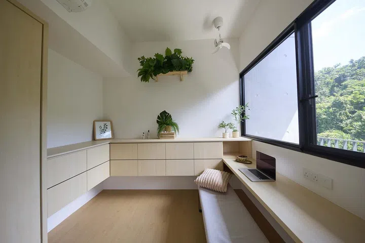 The couple needed a dedicated workspace within the home, so the second bedroom was converted into a study. The wardrobe provided by the developer was hacked and, in their place, Carmen introduced a shallower wardrobe that would encroach less into the limited space. She also added a series of low, wall-hung cabinets and a wall-mounted desk below the window that overlooks the greenery outside. “As a designer, part of my challenge is to work with existing furniture pieces that the clients wish to bring over from their old place. In this case, apart from the sofa, they also wanted to keep their dining bench, which I managed to repurpose into a bench in the study room,” Carmen shares.