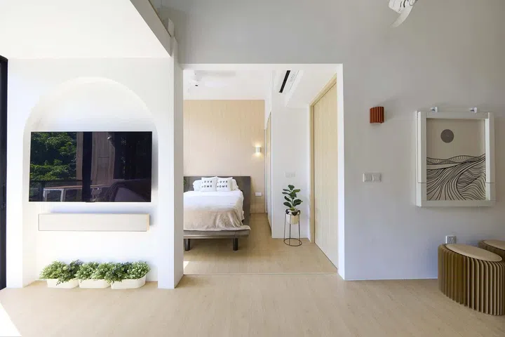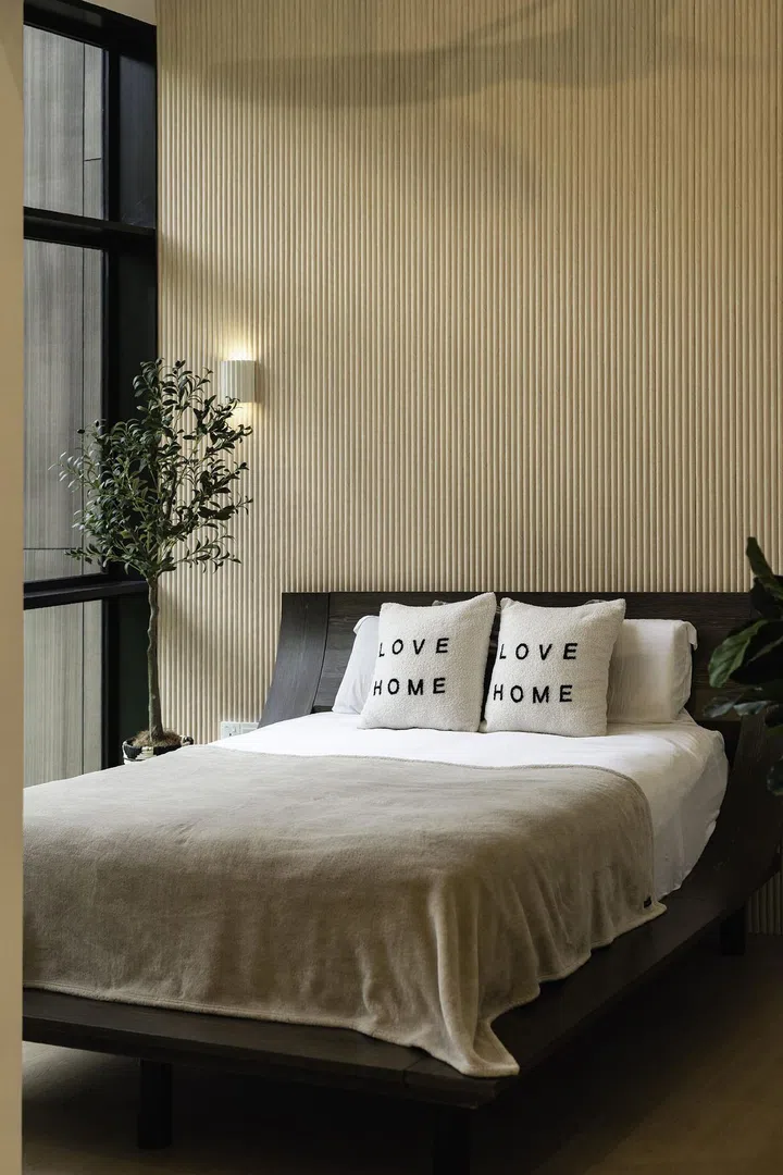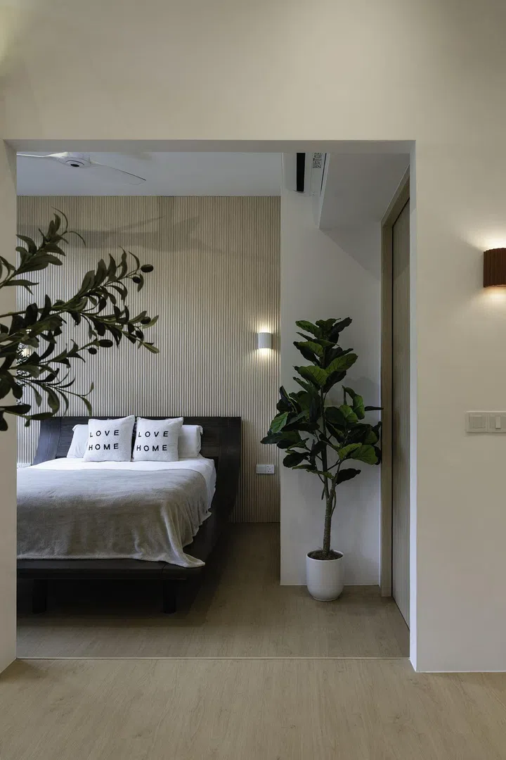 Removing the existing master bedroom door was Carmen’s attempt at enhancing the spatial flow between the bedroom and the living room so that they can “breathe”. The convex fluted panels on the feature wall behind the headboard is her way of deviating from run-of-the-mill fluted panels and to inject a softer touch into the bedroom.