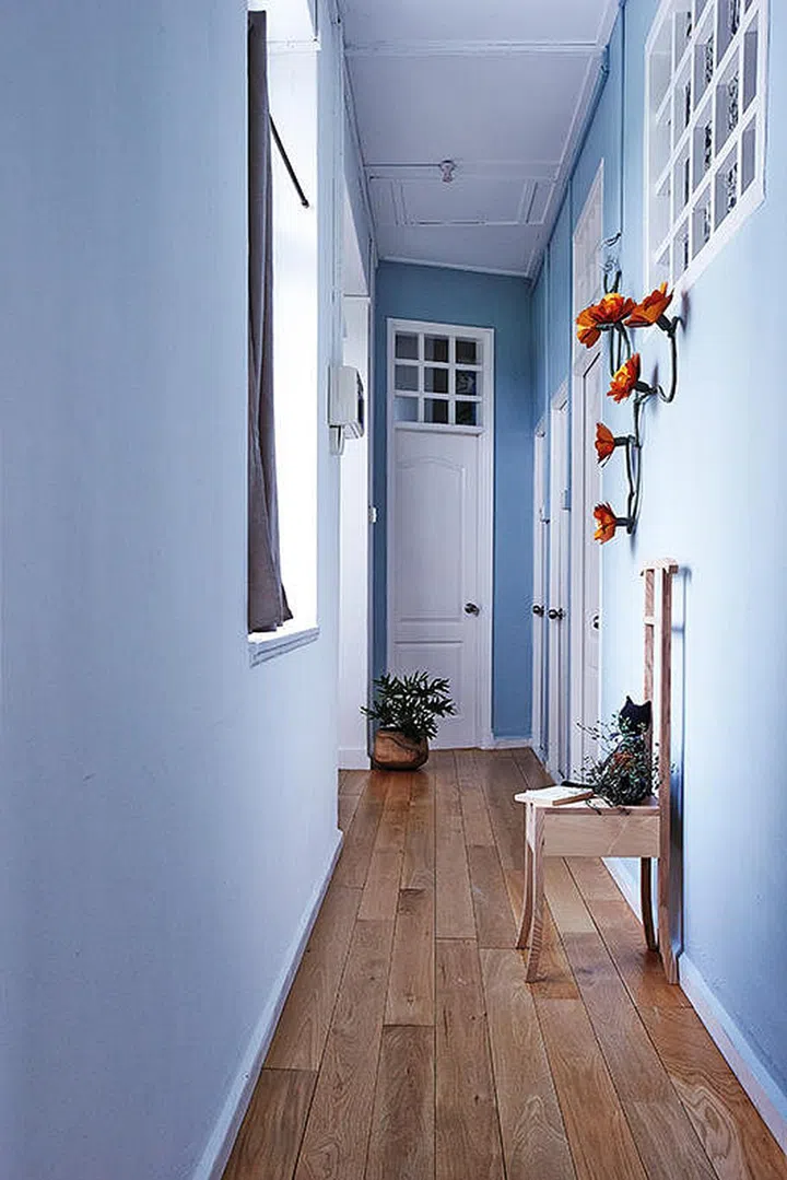 Solid oak flooring was laid over the original floor tiles throughout the home, and the concrete pillar and beam in the living area was painted to resemble rusted steel.