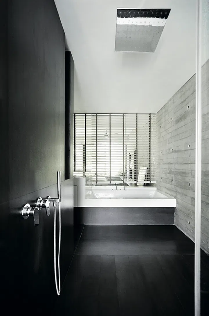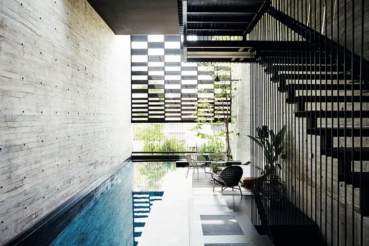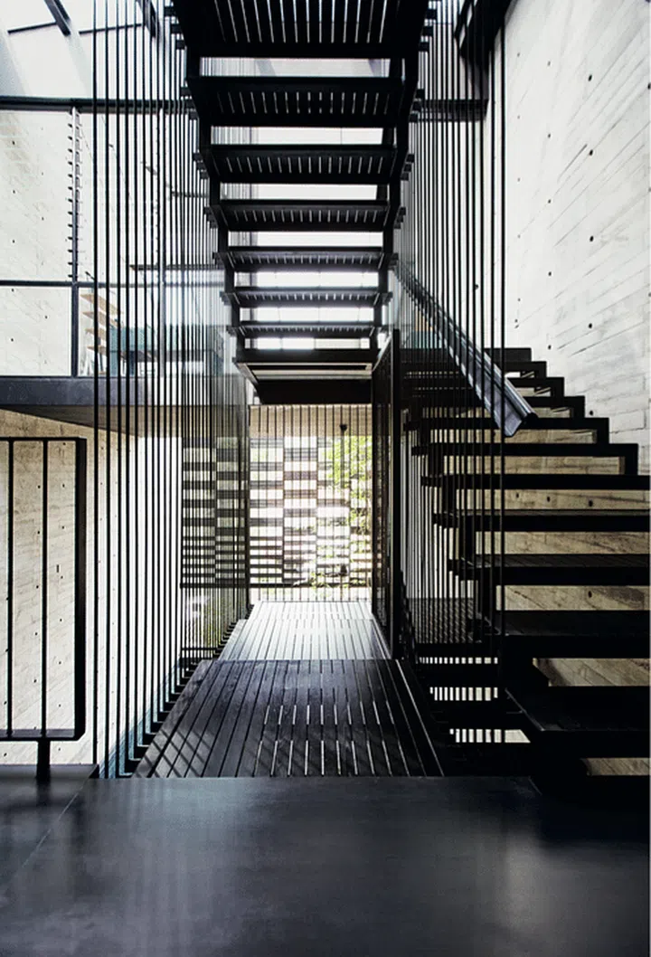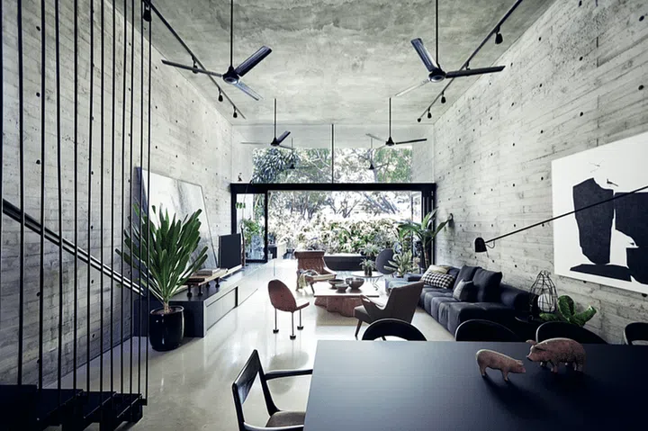 The neutral palette used in this industrial-style, three-and-a-half- storey intermediate terrace house produces a surprisingly bold look that is anything but dull.