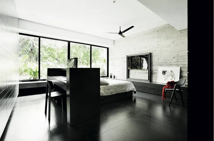 Natural light illuminates the interior of the master bedroom, with windows that span the entire length of the east- facing facade.