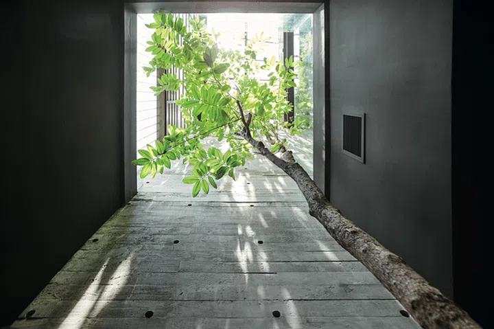 The towering Pink Mempat tree (Cratoxylum formosum), known colloquially as the Singapore Sakura, provides shade above the entrance to the house on the first floor.