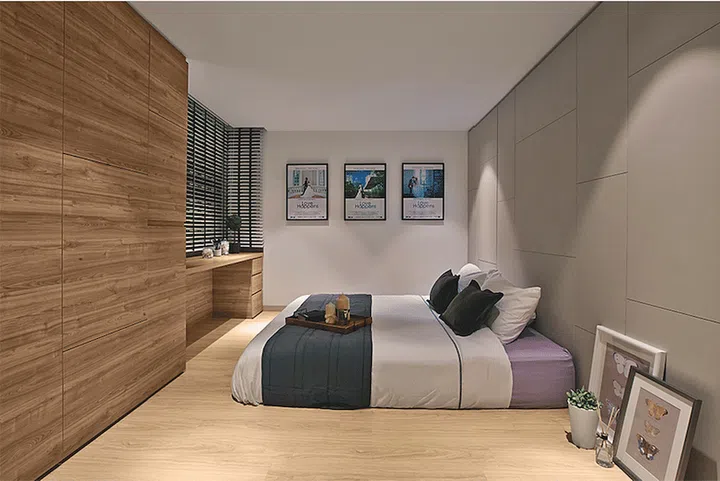 The master bedroom reflects the mod-rustic charm as well. Featuring the same type of laminate as the feature wall, the bedroom has a built-in wardrobe complete with a dressing table at the window area.