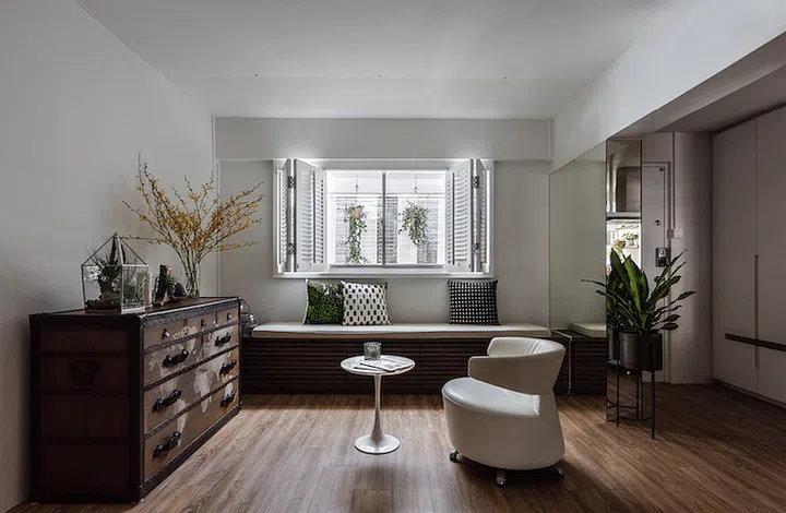 A dedicated lounging space is carved out and positioned adjacent to the entryway. To give the illusion that more light enters the space, the column next to the window is clad in mirrors.