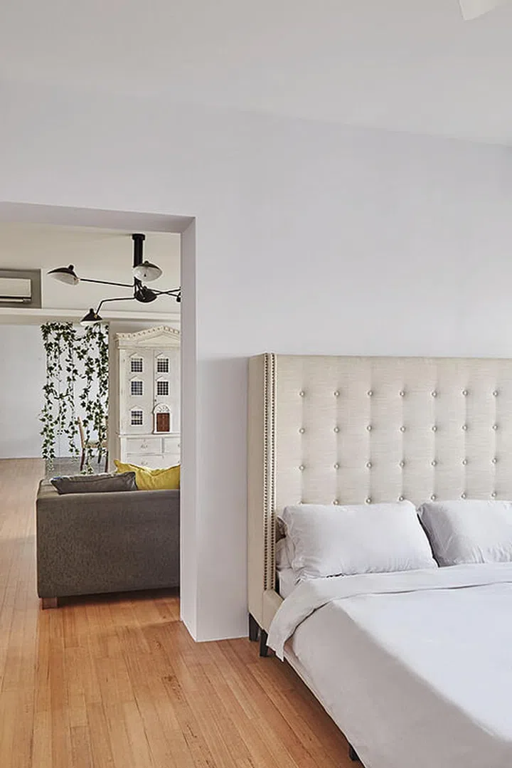 The already spacious flat received a visual upsize when the homeowner decided to knock down the walls that separated the dining, kitchen, and living rooms. With almost-full length windows (and a spectacular view to boot!), the open space evokes a villa-esque airiness. For a simple yet elegant look, linen laminates were applied to the Blum kitchen system. “We chose wood features to imbue warmth, stone finishes for texture, and artificial greenery for easy maintenance,” says interior designer Eddy Kuswandi.