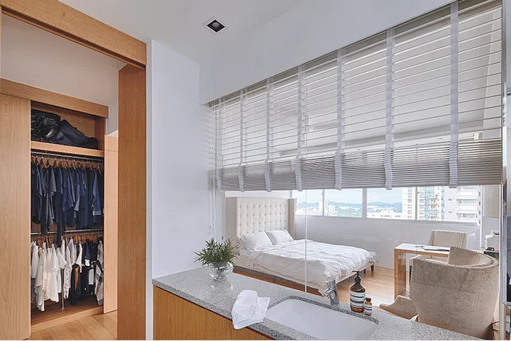 To set a warm tone throughout the space, wood was the main material used for built-ins, such as this display shelf as well as master bedroom’s walk-in wardrobe.