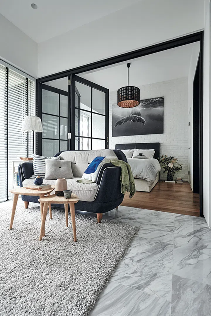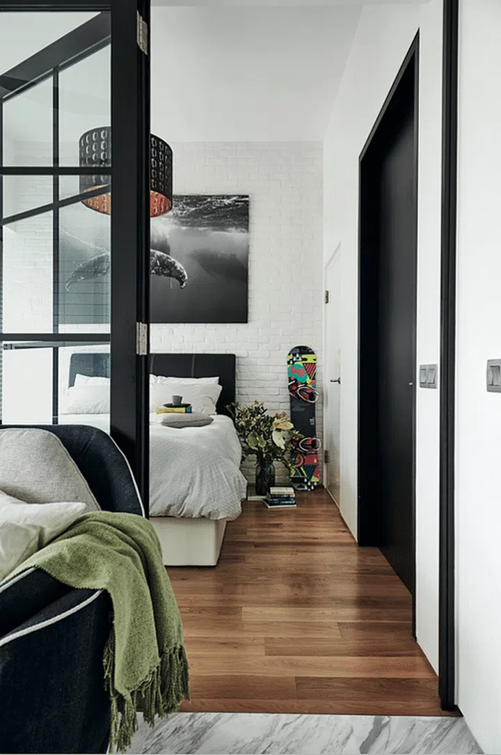 The renovation totalled up to $28,000, and includes folding glass doors with black aluminium frames that separate the living room from the bedroom – a loft archetype that pairs perfectly with the unit’s high ceilings.