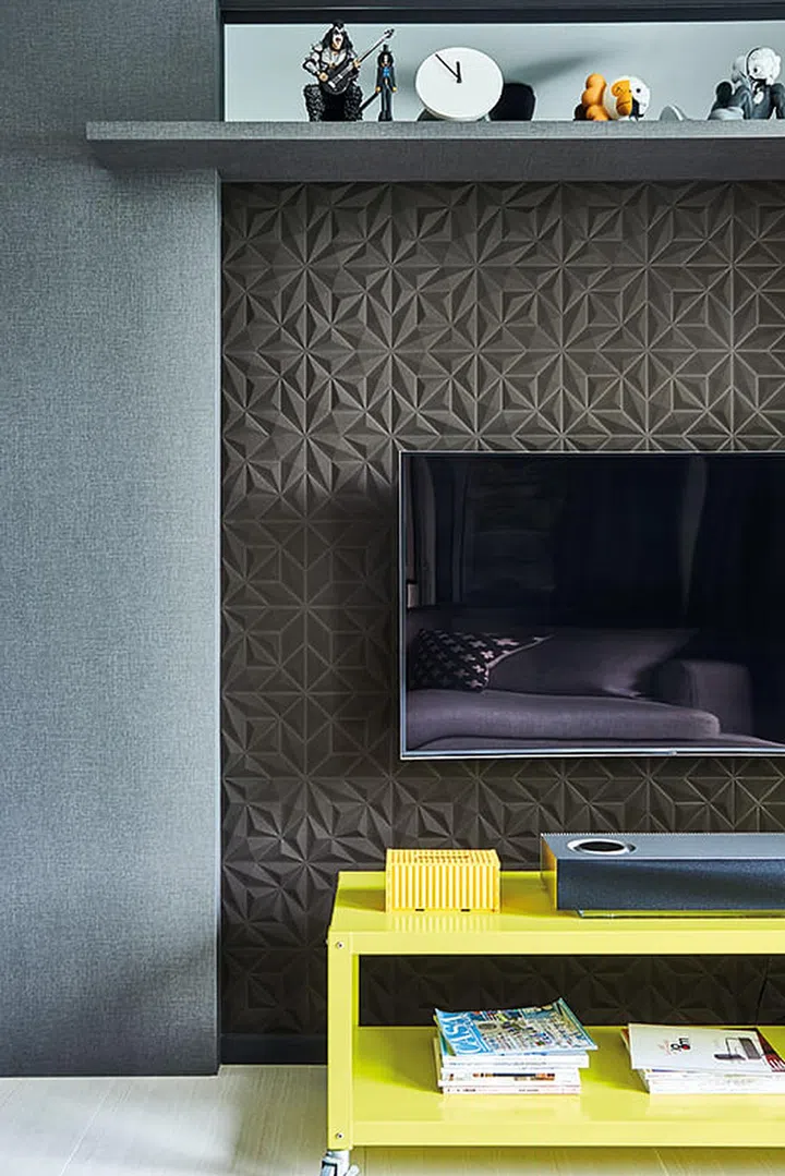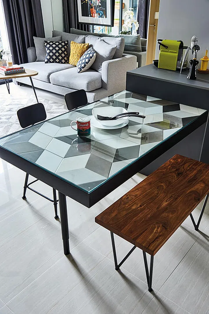 Step inside this Sengkang condo where interior designer Stan Tham transformed a standard 2-plus-1 bedroom unit into an eclectic, personality-filled home with geometric elements, textured materials, and artistic accents—all within a $30,000 renovation budget in 2017.