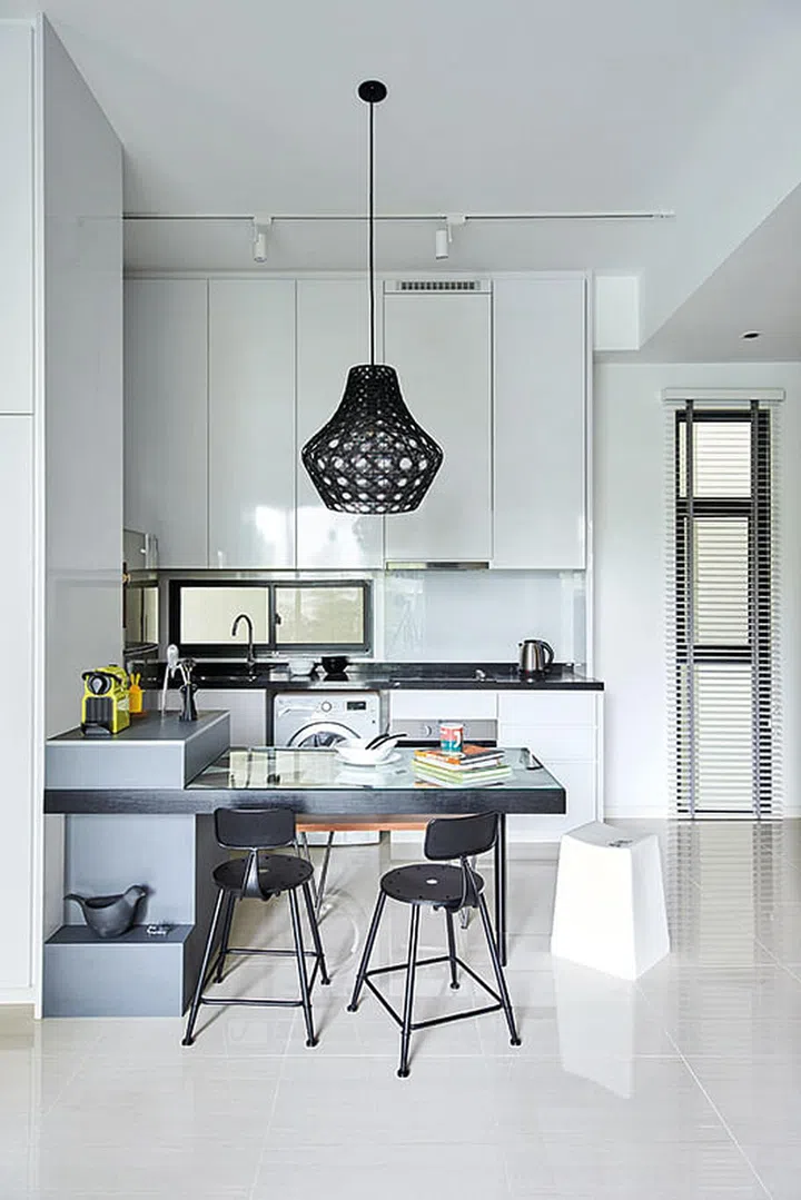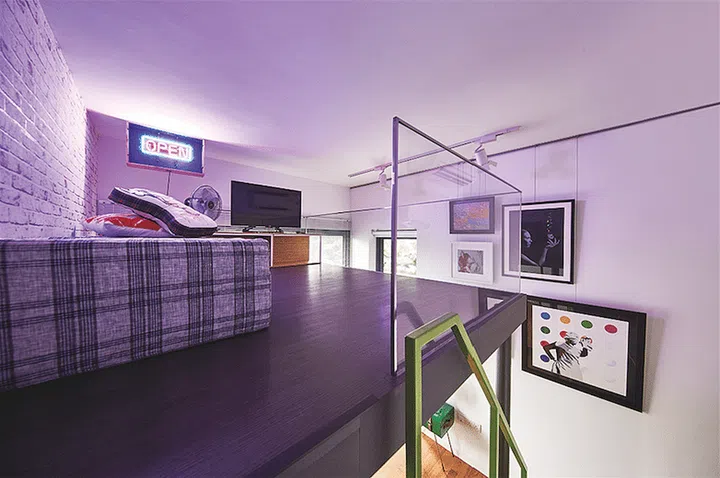 This ingenious utilization of vertical space maximizes the condo’s limited square footage, creating distinct functional areas without sacrificing openness or requiring additional built square meters. The split-level arrangement establishes natural boundaries between work and relaxation zones while maintaining visual connection throughout the space.