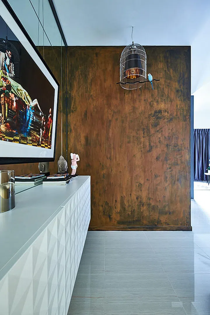 In front of the attention-grabbing rusted metal wall that greets you as you enter the home, a decorative fixture comprising a lamp from John Erdos, as well as a bird and branch figurine bought online, shows the designer’s creativity and unique style.