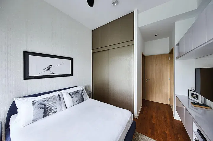 The bedroom is kept simple and restful, with just the essential furniture pieces and a neutral colour scheme. This deliberate restraint in the private quarters creates a serene sanctuary optimized for quality sleep and relaxation.