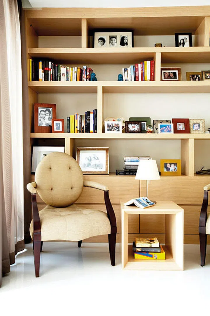 In the living area, a striking floor-to-ceiling display shelf became more than just storage – it evolved into a personal gallery where the family’s journey unfolds through carefully arranged books, photographs, and treasured mementos from their global adventures. The towering shelf not only personalizes the intermediate terrace house but also draws the eye upward, emphasizing the home’s generous height.