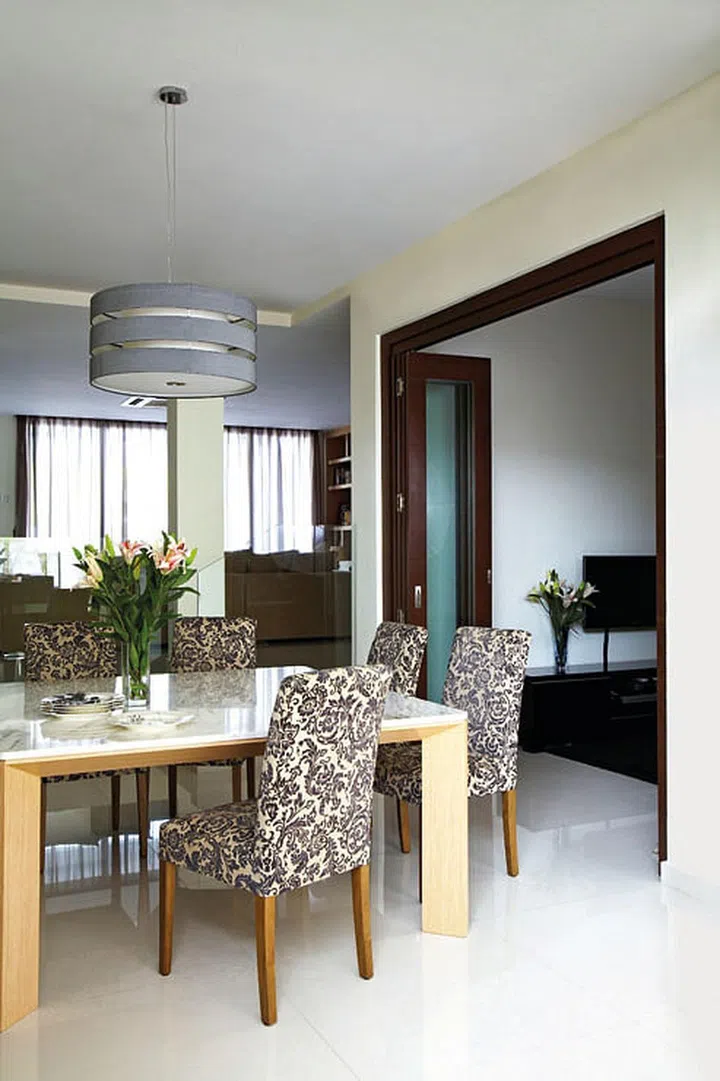 The dining area showcases the power of custom craftsmanship in terrace house renovation. A bespoke dining table commands attention with its distinctive design, adding architectural interest to the space while serving as a gathering point for family meals and conversations.
