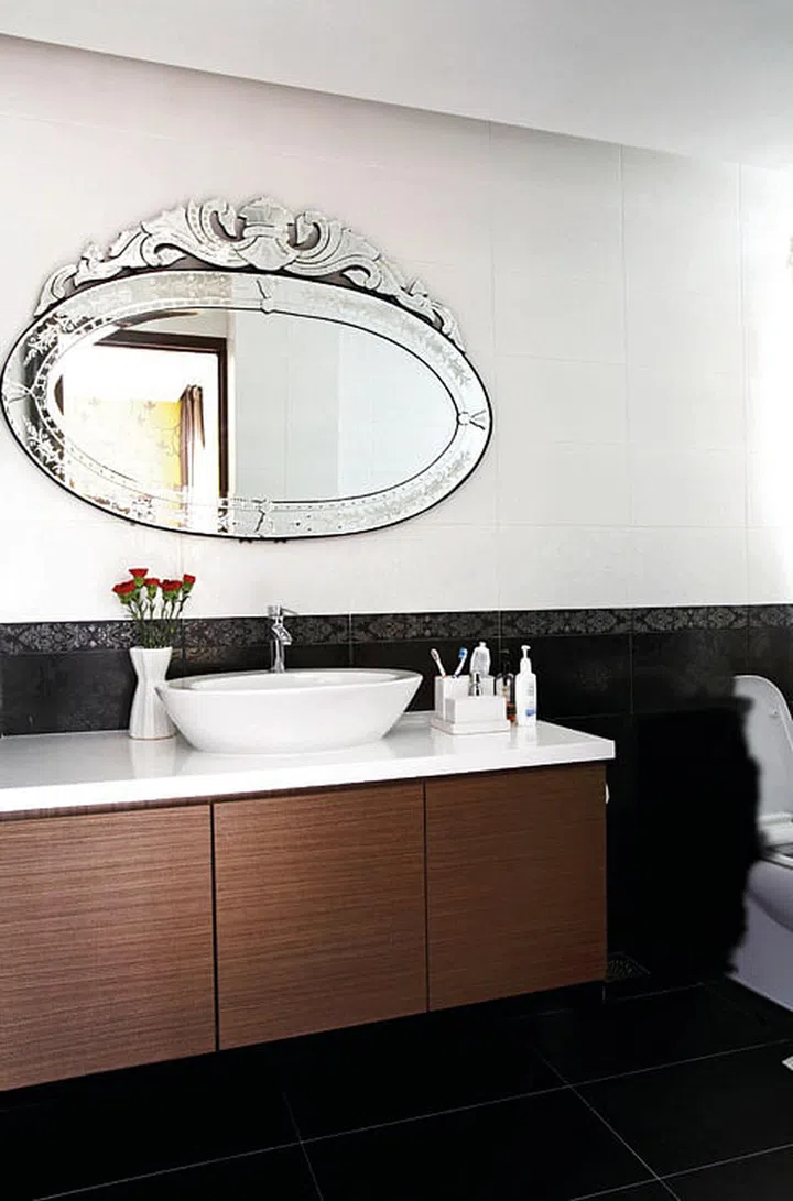 The bathroom and bedroom spaces reveal the Toltons’ eye for unique pieces that make a statement. Venetian-style etched mirrors, discovered during their furniture sourcing adventures, add unexpected glamour to these intimate spaces. The ornate bathroom mirror, Dea’s elegant dressing table, and the sophisticated bedside tables prove that in terrace house renovation, sometimes a single well-chosen decorative element can transform an entire room from simple to spectacular. These pieces serve as brilliant examples of how personal touches can elevate a space without overwhelming it.
