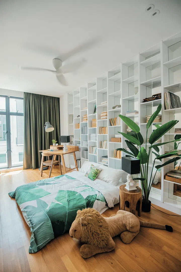 The full-height library wall in the younger son’s bedroom is a series of open bookshelves made of thin acrylic panels, so that they share the home’s high-gloss white aesthetic. Each niche comes with a clear mirror backing to reflect daylight streaming from the bedroom window.