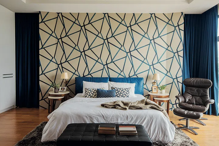 Wallpaper with a blue pattern was specifically chosen for the master bedroom on the second level, as blue is one of the key colours in the couple’s collection of traditional Chinese porcelain ware.