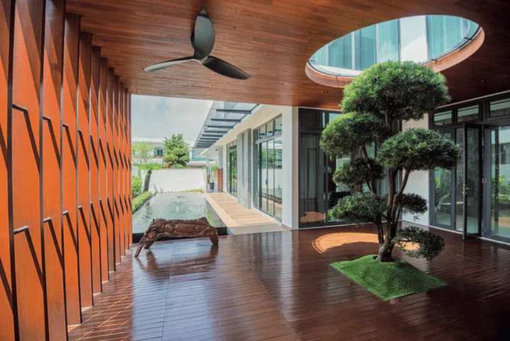 The outdoor area is clad in chengal timber. A glass opening at the top allows for daylight to stream in, lending a breezy and natural feel to this part of the house. Shanxi black granite was used for the raised koi infinity pond, for a contemporary touch.