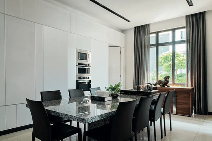 The custom-made dining table is crafted from solid polished sea wave granite. The white acrylic wall panels with a polyurethane spray-paint finish conceal storage cabinets.
