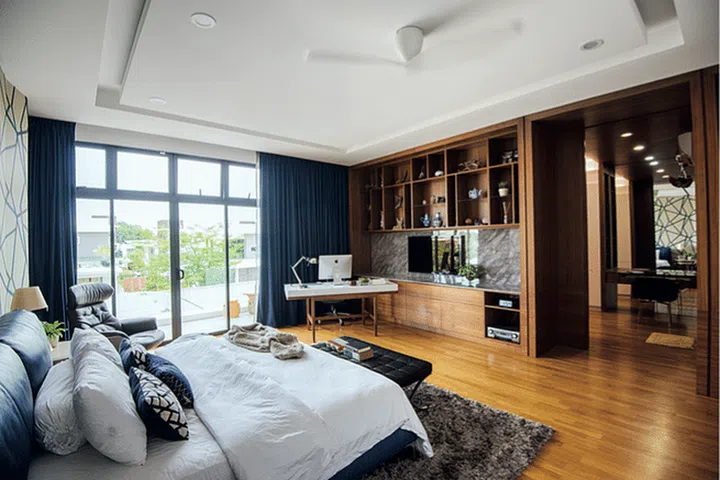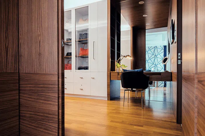 The master bedroom leads into the spacious walk-in wardrobe and dressing table, an example of walnut-toned “timber box” sections of the house.