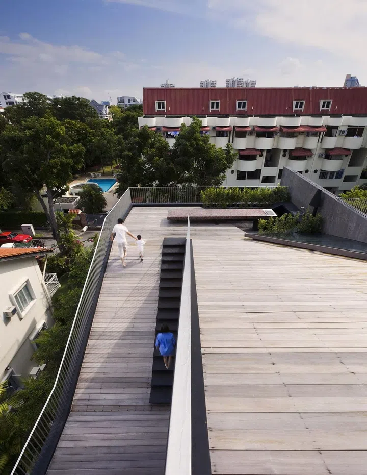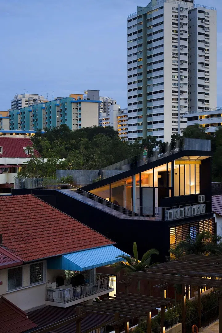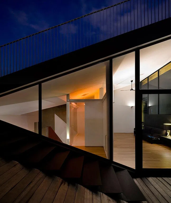 Viewed from the back fo the home, one realises that the angle of the sloping deck conforms to the angles of the neighbouring rooftops. This helps to keep the look of the home in tandem with the styles of the surrounding houses.