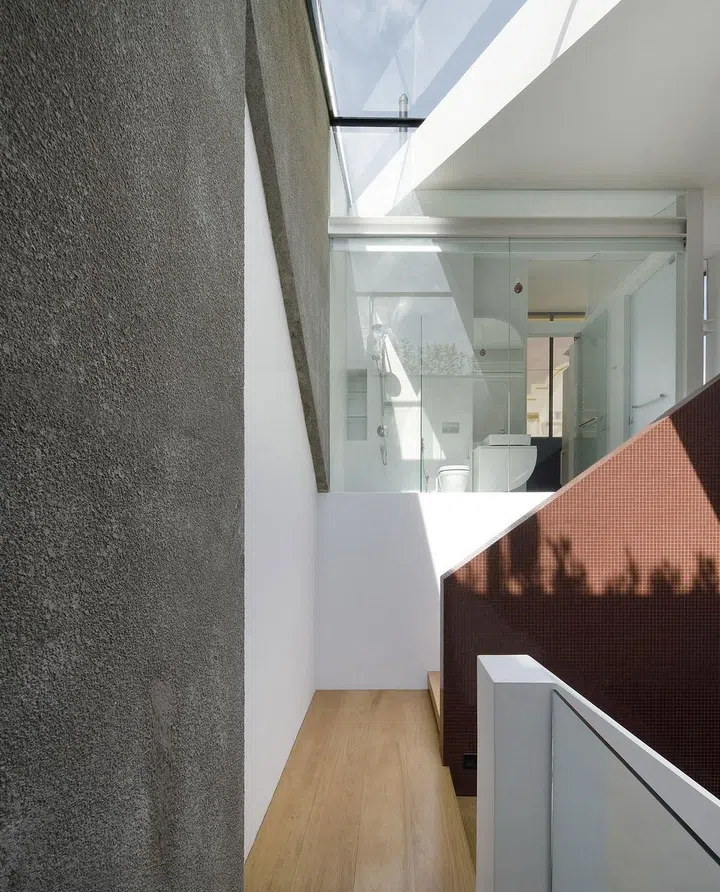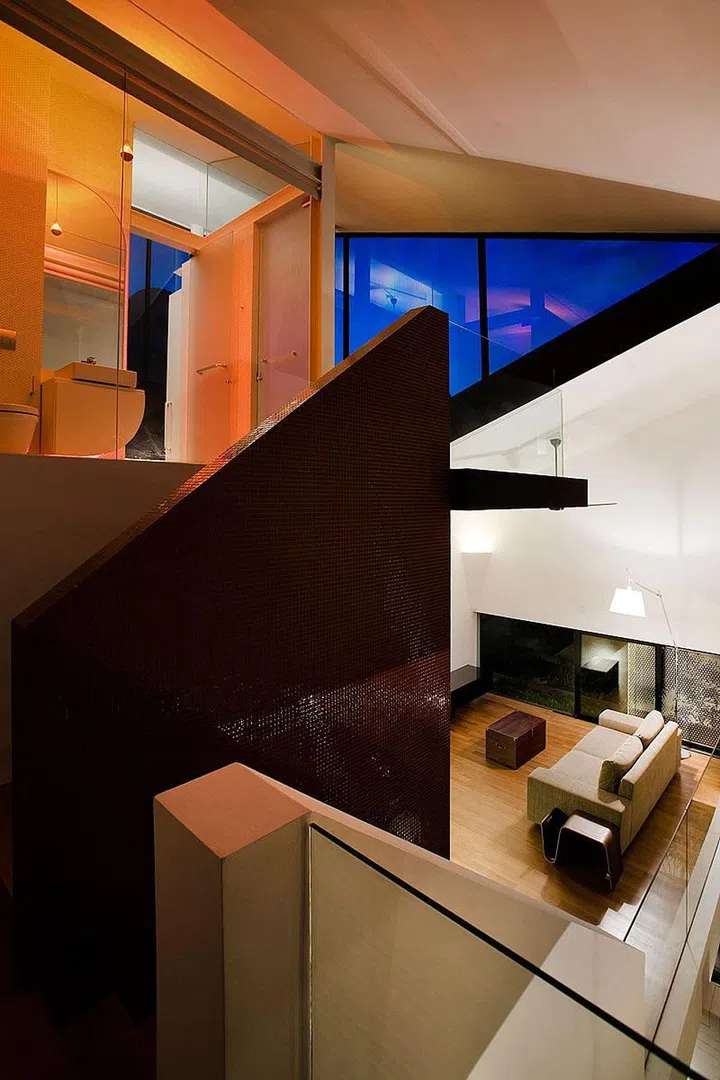 The young couple was open to radical options when the architect team proposed them, including the design of a bathroom on the upper floor with a glass wall overlooking the stairway.