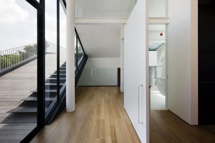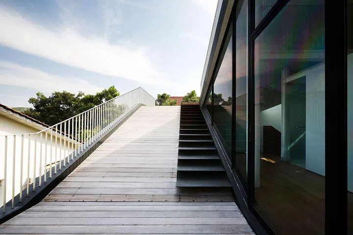 The main feature of this home is up on the roof, where the architect team designed a sloping outdoor roof terrace.