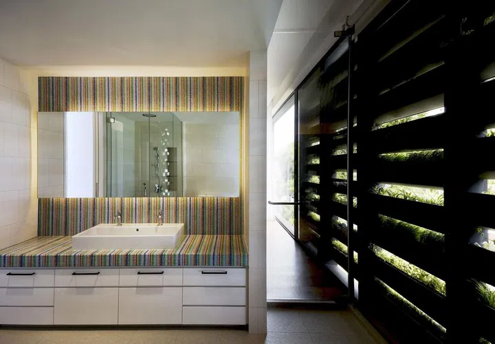 A rainbow-coloured mosiac counter graces the master bathroom positioned just behind the planter wall.