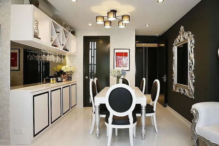 On one side of the dining area is a white shelf that hangs above a white counter and houses Ms Tay's wine collection.