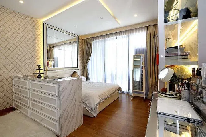 Cove lighting, installed directly above the bed, and parquet flooring give the room a warmer ambience, compared with the living and dining areas.
