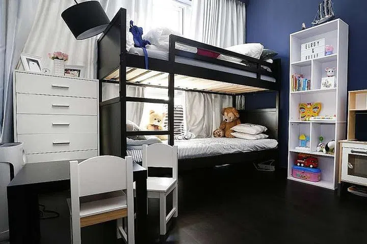 Ellie's room is painted in pink, while her brother's is navy blue.