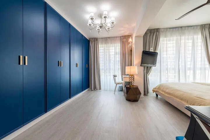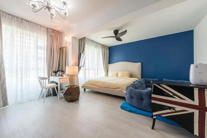 The master bedroom tells a touching story of family togetherness, as the homeowners specifically designed it to accommodate their children’s sleeping arrangements. A serene blue accent wall serves as a calming backdrop, while the matching wardrobe introduces a cheerful pop of color that brightens the space.