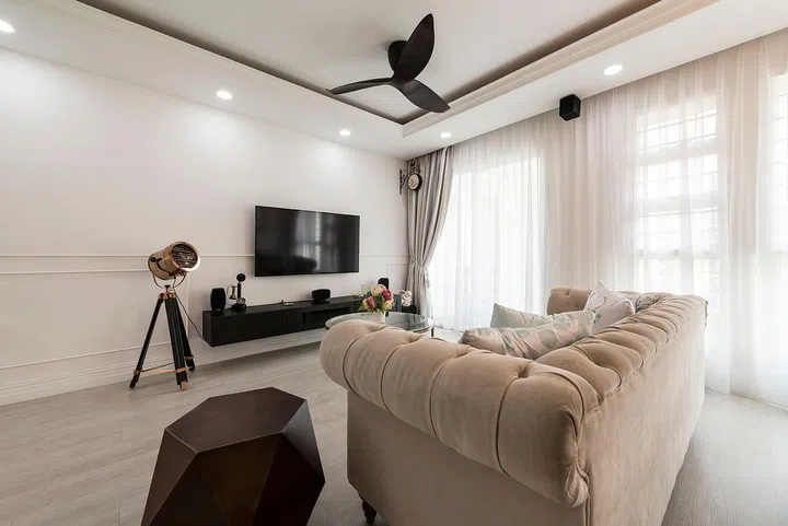 This stunning transformation, accomplished with a renovation budget of $48,000 (excluding electrical and air-conditioning works), showcases how Classical-inspired design principles can be thoughtfully adapted to modern HDB living.