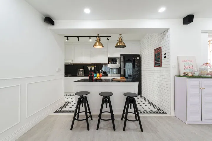 In a departure from traditional HDB layouts, the kitchen embraces an open-concept design that enhances the home’s spacious feel. The timeless combination of black and white creates a sophisticated culinary space, where patterned tiles add visual interest and texture to the overall design.