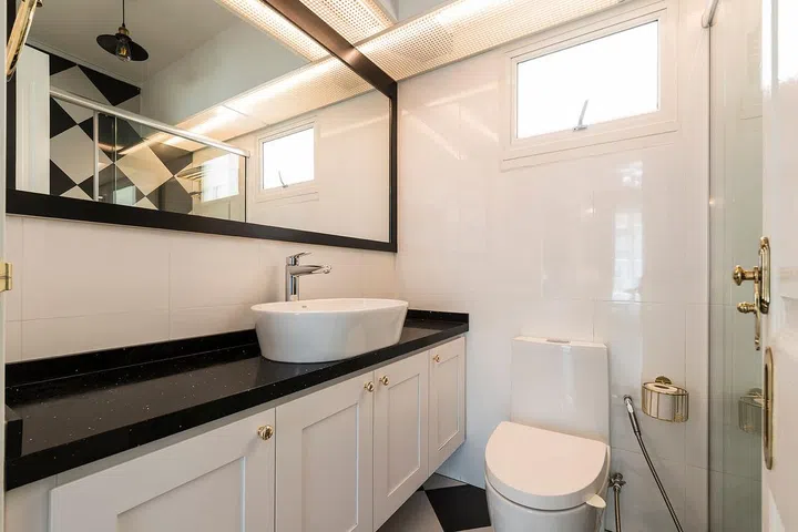 The bathroom continues the kitchen’s sophisticated black and white narrative, elevated by luxurious gold and brass fixtures that add warmth and refinement. These carefully chosen elements maintain the Classical-inspired interior design theme throughout every corner of this Punggol BTO home.