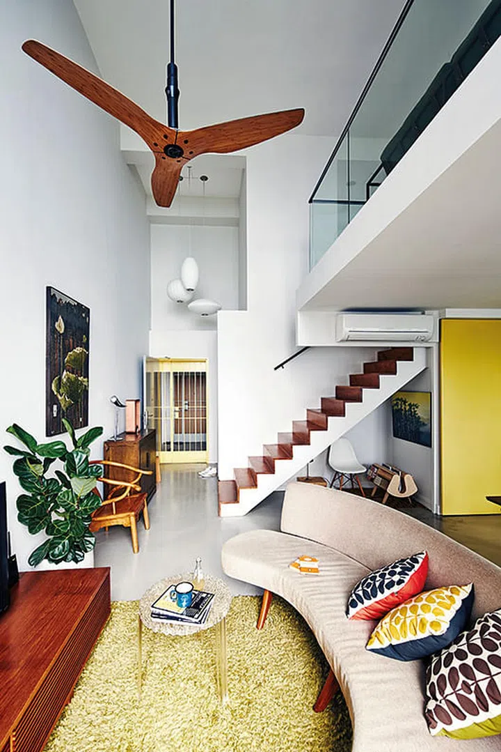 They opened up the space visually by taking down the walls of the mezzanine level and removing the banisters. Working with the high ceiling, the husband chose a Haiku fan with an extended rod, which lowers the fan into the space.