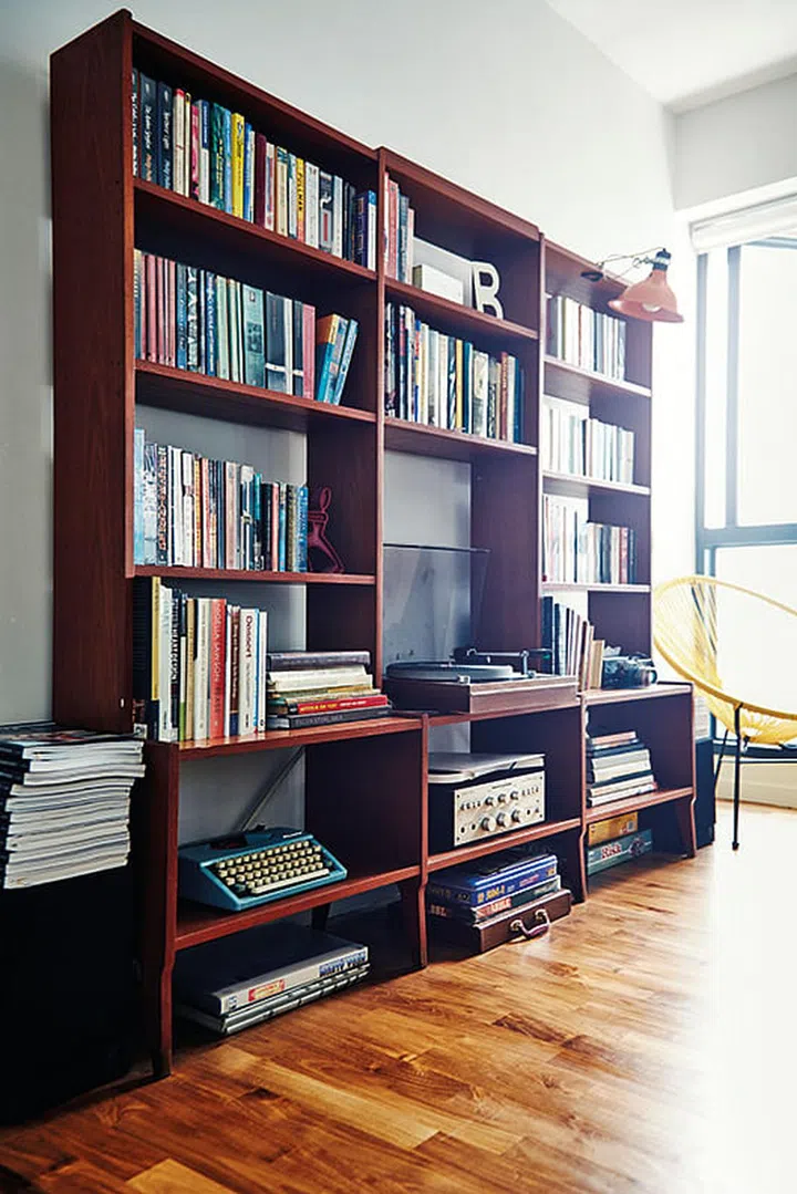This bookshelf from the 1970s houses a range of old items — the wife's extensive book collection (including the first book her father gave her), board games and a vinyl record player.