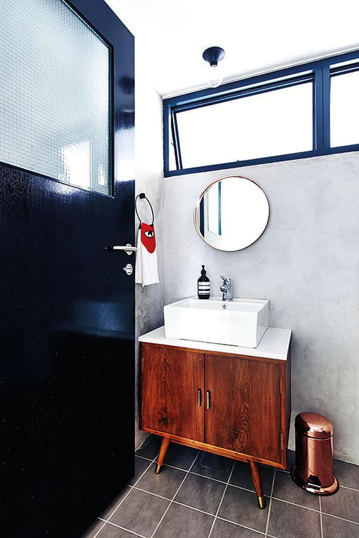 The common bathroom is kept minimal, with a simple faucet by Grohe and a copper-framed mirror that was bought online.