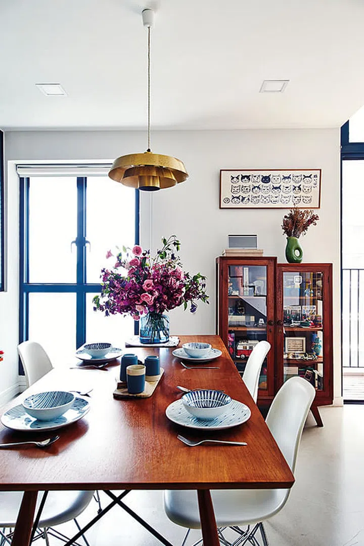 The vintage wooden cabinet is home to figurines, old cameras, and items the wife makes, such as crochet coasters. Flowers by Floral Magic, tableware from Stylo Deco.