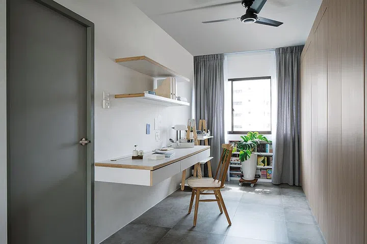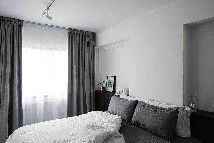 Breaking slightly from the light, airy aesthetic that dominates the rest of this Scandinavian HDB, the master bedroom introduces a more dramatic tone with grey as its primary color. This darker palette echoes the ash-grey shade found on all the home’s doors, creating a subtle thread of continuity throughout the space while maintaining the sophisticated simplicity characteristic of Scandinavian design.