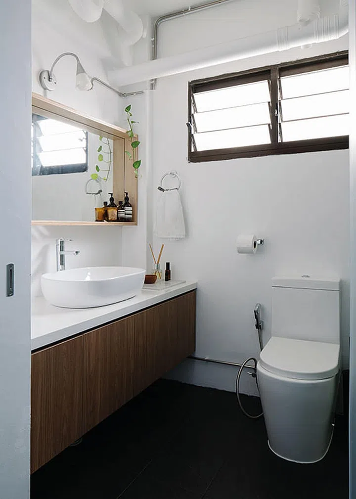 The master bathroom returns to the home’s rustic-chic theme, proving that Scandinavian interior design principles can transform even the most functional spaces into style statements. A thoughtfully designed rectangular mirror incorporates a practical built-in niche for toiletries, demonstrating how careful planning can enhance both aesthetics and functionality in a Scandinavian HDB setting.