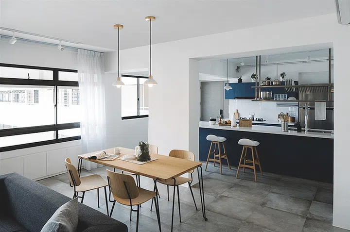 In the dining area, the careful selection of wood-accented furniture brings rustic warmth to the Scandinavian interior design scheme. The unconventional choice of larger floor tiles creates an optical illusion of expanded space, a clever design trick that makes this Scandinavian HDB feel more spacious than its actual dimensions.