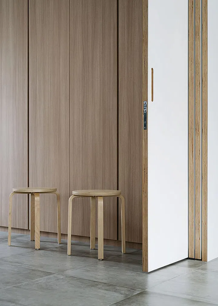 One of the most innovative features of this home is the sliding panel system that conceals the study and walk-in wardrobe. When closed, these panels serve double duty as sophisticated wall elements, demonstrating how Scandinavian interior design can seamlessly blend form and function.