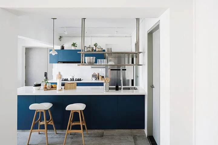 “I wanted a clean and modern look, so I proposed a Scandinavian theme, which went down well with the owners,” Joy explains. The attention to detail in this Scandinavian HDB kitchen is remarkable, from the thoughtfully designed top-hung cabinets that incorporate space for greenery to the industrial-chic suspended stainless steel rack that adds a contemporary edge to the space.