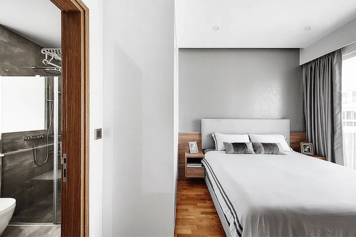 The bedroom continues the sophisticated grey palette established throughout the Sembawang condominium unit, with warm wooden flooring adding a natural element that softens the space. This thoughtful combination of materials and colors creates a restful retreat that perfectly balances modern design with comfortable living.