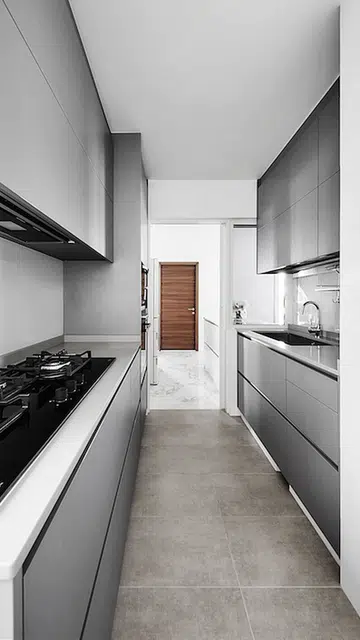 The kitchen design reflects a practical yet elegant approach, divided into wet and dry areas separated by a sliding door. The dry kitchen maintains a minimalist white aesthetic, while the wet area continues the home’s grey theme, creating a cohesive flow throughout the 3-bedroom condo.