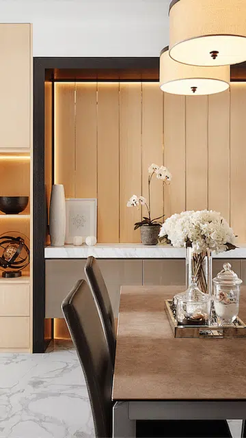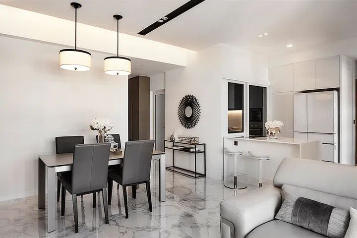 Strategic concealed lighting in both living and dining areas adds an extra dimension of elegance to the Sembawang condominium unit, while the intricate grains of white marble throughout create an enhanced sense of spaciousness. The overall neutral palette achieves its intended purpose, establishing a peaceful sanctuary within this urban home.