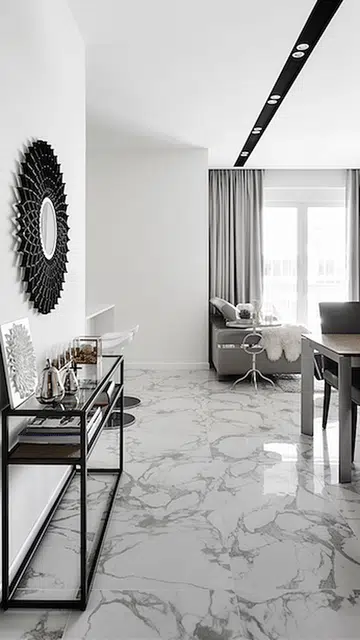 The living room of this 3-bedroom condo showcases a stunning Volakas marble slab as the TV backing, its natural patterns harmonizing perfectly with the room’s dominant grey palette. Throughout the space, furnishings in varying ash tones create a sophisticated layered effect, from the carefully selected sofa to the textured rug beneath.
