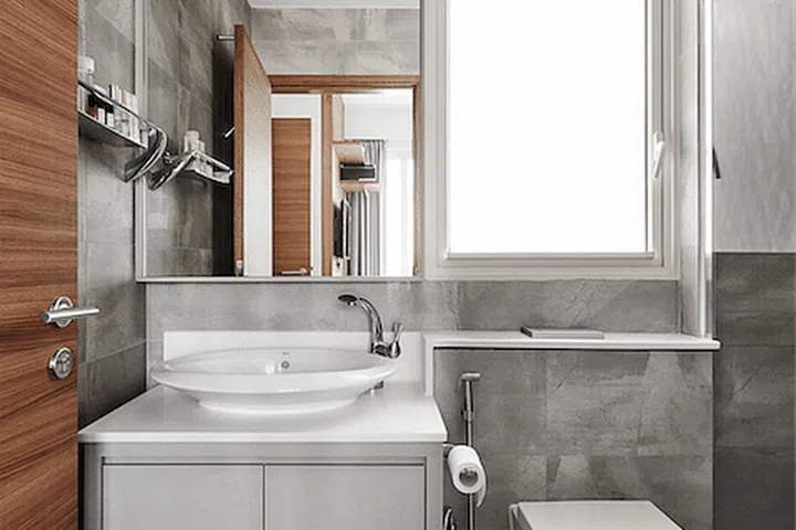 While the bathroom design embraces simplicity, it’s far from basic in this Sembawang condominium unit. The space continues the home’s sophisticated grey and white palette, with carefully selected materials that enhance both functionality and visual appeal. Large-format tiles in a cool grey tone line the walls, creating a seamless look that makes the bathroom appear more spacious while requiring minimal maintenance – a practical consideration that doesn’t compromise on style.
