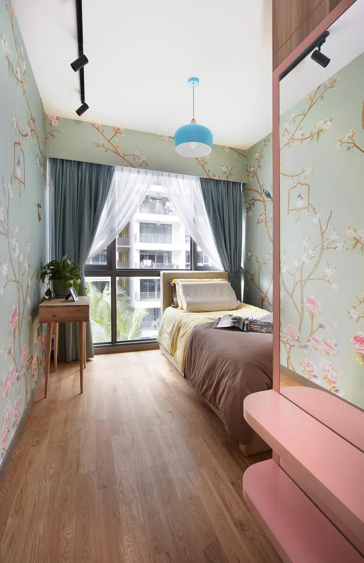 The guest bedroom looks different, to mix things up. Instead of adopting the geometric theme, it takes on a more romantic, feminine feel, with the use of floral wallpaper.